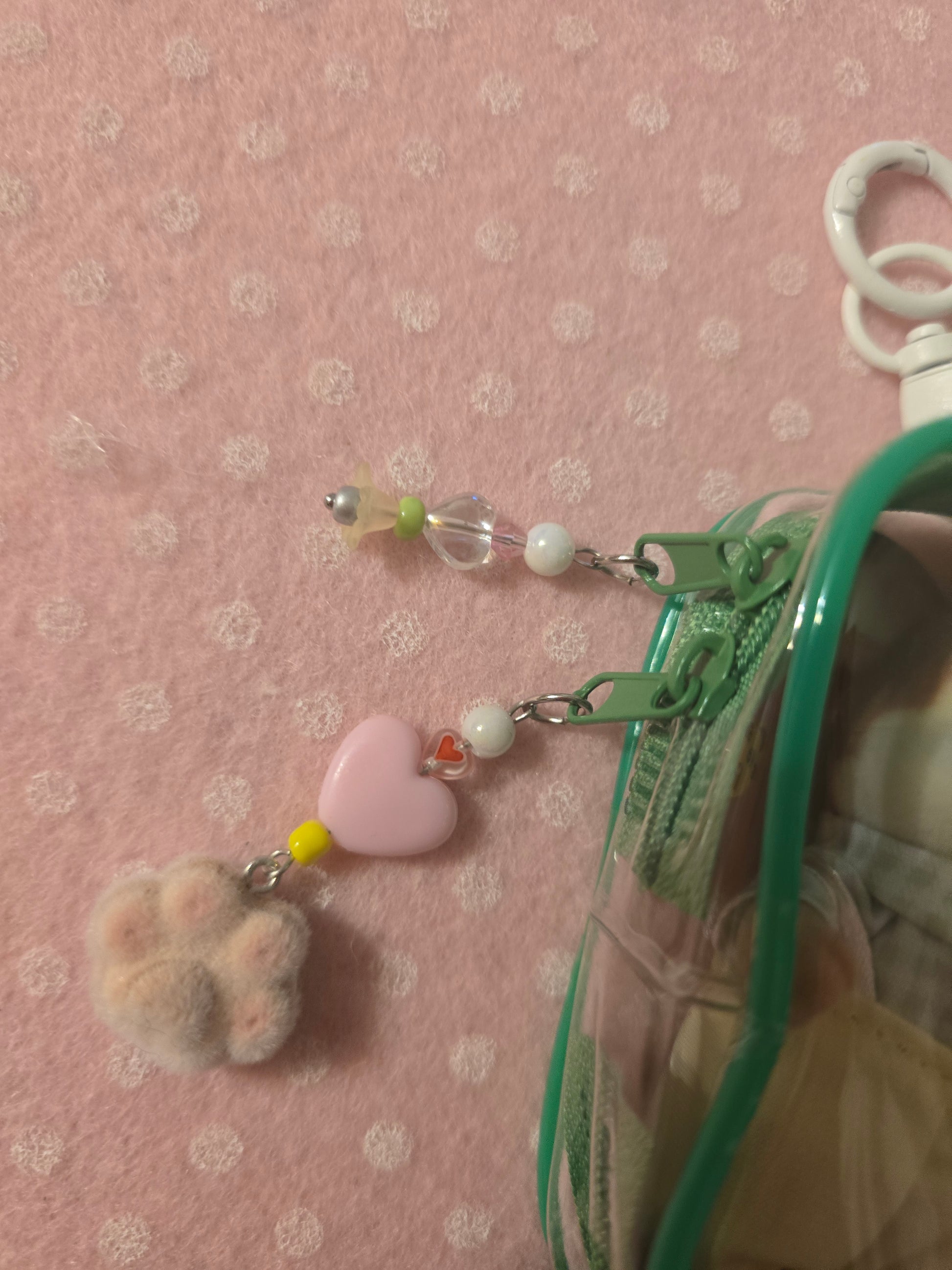 La borsina ha charm in acciaio con perline e zampina di velluto.